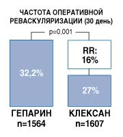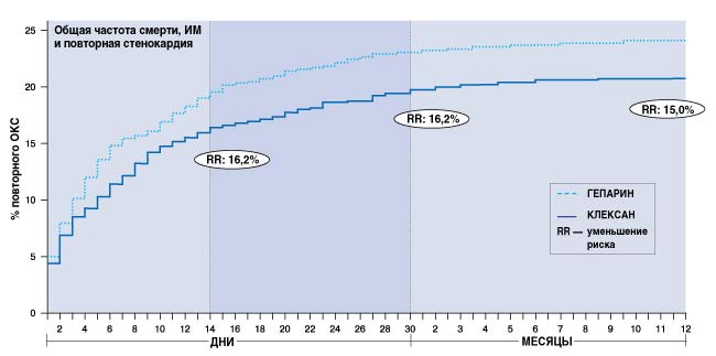 Клексан значительно снижает общую частоту смерти, ИМ, повторной стенокардии на 14-й (р = 0,019) и 30-й (р = 0,016) день. Клексан значительно уменьшает число больных, нуждающихся в оперативной реваскуляризации (р = 0,001)