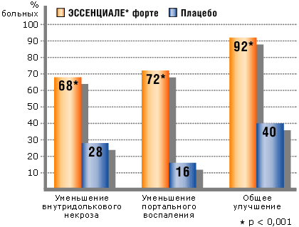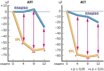 Лечение эссенциальными фосфолипидами приводит к значительному улучшению биохимических показателей, таких, как сывороточные АЛТ, АСТ, а также к уменьшению некроза и воспаления.