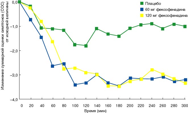 Рис. 1. Однократная доза фексофенадина 60 или 120 мг уменьшала симптомы САР в течение 60 мин в плацебо-контролируемом исследовании на 99 пациентах, подвергнутых воздействию пыльцы в камере, моделирующей условия окружающей среды. Кривая изменения суммарной оценки симптомов (СОС)