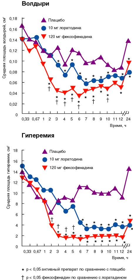 Модель вызванных гистамином отека и гиперемии кожи также использовалась для сравнения активности фексофенадина и лоратадина в двойном слепом перекрестном исследовании в четырех группах с применением однократных доз препарата. В рандомизированном исследовании 20 здоровых добровольцев в течение 4 дней последовательно получали 60 мг фексофенадина 2 раза в сутки; 120 мг фексофенадина 1 раз в сутки; 10 мг лоратадина 1 раз в сутки или плацебо. Перед применением препаратов подкожным введением гистамина фосфата в дозе 1 мг/мл вызывали отек и гиперемию кожи, которые оценивались перед применением лекарств и через 20, 40, 60 мин; затем через каждый час в течение 12 часов; через 24 часа после их применения (рис. 2). Все три схемы применения антигистаминных препаратов эффективно подавляли отек и гиперемию, по сравнению с плацебо, в течение 24-часового периода изучения. Отсроченный эффект (до 24 часов) фексофенадина был сравним с таковым у лоратадина. Однако фексофенадин в дозировке 120 мг в сутки значительно сильнее подавлял образование волдырей, по сравнению с лоратадином, во временных интервалах со 2-го по 6-й час и с 8-го по 10-й час и гиперемию в интервале со 2-го по 5-й час. К тому же фексофенадин демонстрировал более быстрое подавление как волдырей, так и гиперемии по сравнению с лоратадином.