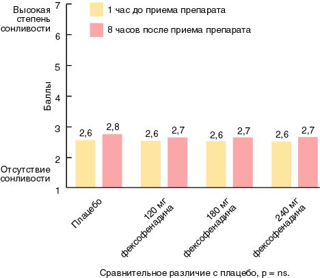 Рис. 3. Фексофенадин — препарат подлинно неседативный, без значительного увеличения субъективной сонливости по сравнению с плацебо