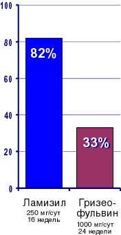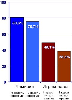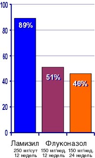Ламизил обеспечивал больший процент излечения онихомикоза по сравнению с итраконазолом.