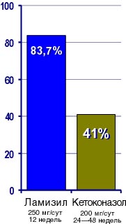 Излечение в группе больных, получавших терапию Ламизилом, наступало быстрее.