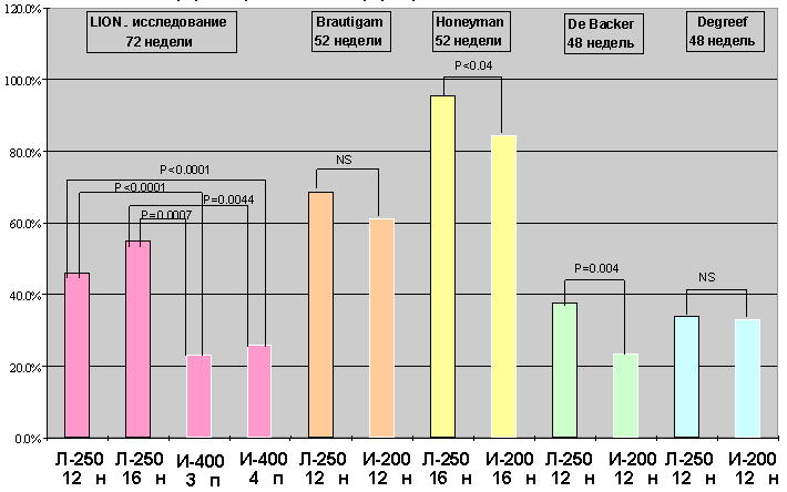 5 двойных слепых сравнительных исследований эффективности Ламизила (Л) и итраконазола (И). Процент микологического излечения.